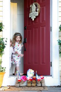 In Germany St. Nikolaus is kind of comparable to the US Christmas stockings I guess, at least the way I was raised. So last night the kids each put 1 pair of boots in front of the house for Santa to stop by and drop off a ‚preview‘ for Christmas, that is IF the kids behaved. lol Which for the most part they did, so this morning the first thing that came out of Zizi’s mouth wasn’t her usual „Guten Morgen, Mami!“ but „Where are my presents from Santa, Mami?“ So I went outside first to position myself in front of the door, camera in hand of course, to document everything.