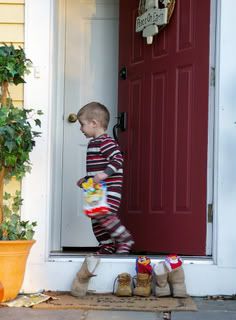 It was simply priceless! Here they were rushing through the door. Zizi of course took the candy and the boot containing her new PJ’s. The little 2 …well, different story! They could’ve cared less about the PJ’s. They acted like a bull seeing a red flag….the red flag being the Kinder candy bag! Hahaha Nothing else matter anymore. Needless to say, they snatched the bag, left everything else ran back inside and slammed the door shut right in front of my eyes. Awesome! I guess Craig must have noticed that some things were missing because not even 10sec later the door swung open again and my 2 little ones came back to retrieve the missing gifts. Jeez….likes I said before….absolutely priceless! Once I was back inside and C.J. realized what character was on his PJ’s (Spider Man, which is his 2nd favorite right after Curious George) he was thrilled and shouted: „OH MY GOSH!“ Guess he was happy about it after all!